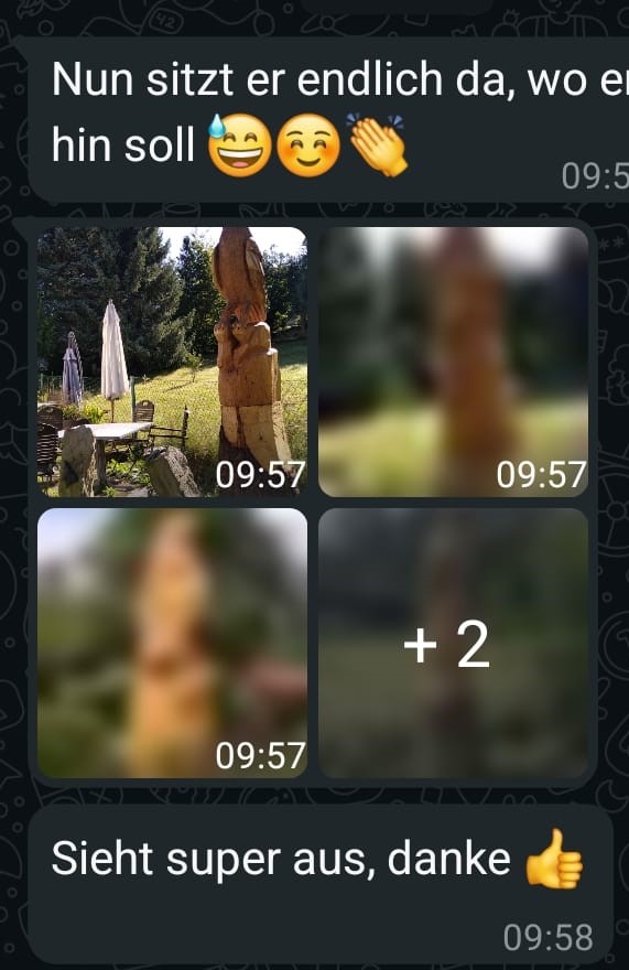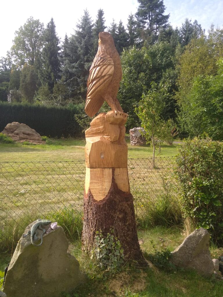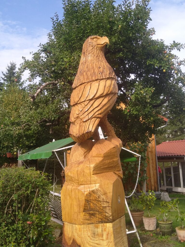 Die Fertigungszeit variiert je nach Größe und Komplexität der Skulptur. Eine mittelgroĂźe Figur, wie ein Adler von ca. 80 cm, kann innerhalb von 2–3 Tagen fertiggestellt werden. FĂĽr größere oder besonders detaillierte Kunstwerke kann es etwas länger dauern.